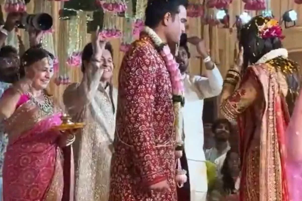 Arjun Tendulkar, son of cricket legend Sachin Tendulkar, tied the knot with entrepreneur Saaniya Chandhok in a grand ceremony in Mumbai. The wedding, which took place on Sunday, has been the talk of the town, with videos of the ceremony going viral on social media.