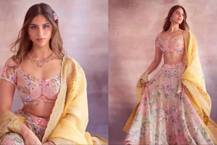 Suhana’s lehenga was designed by none other than the renowned designer, Manish Malhotra. The outfit featured a delicate pastel pink color, which was beautifully complemented by intricate floral embroidery. The lehenga was further enhanced with polki work, adding a touch of sparkle and glamour to the ensemble. Suhana paired the lehenga with a matching dupatta, which was draped elegantly over her shoulder.